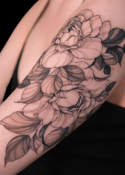 Art Deco floral chest piece by Cortney Norton.  Floral tattoos are a timeless choice, embodying elegance, growth, and the cycle of life. Whether you're considering a delicate blossom or a bold flo...