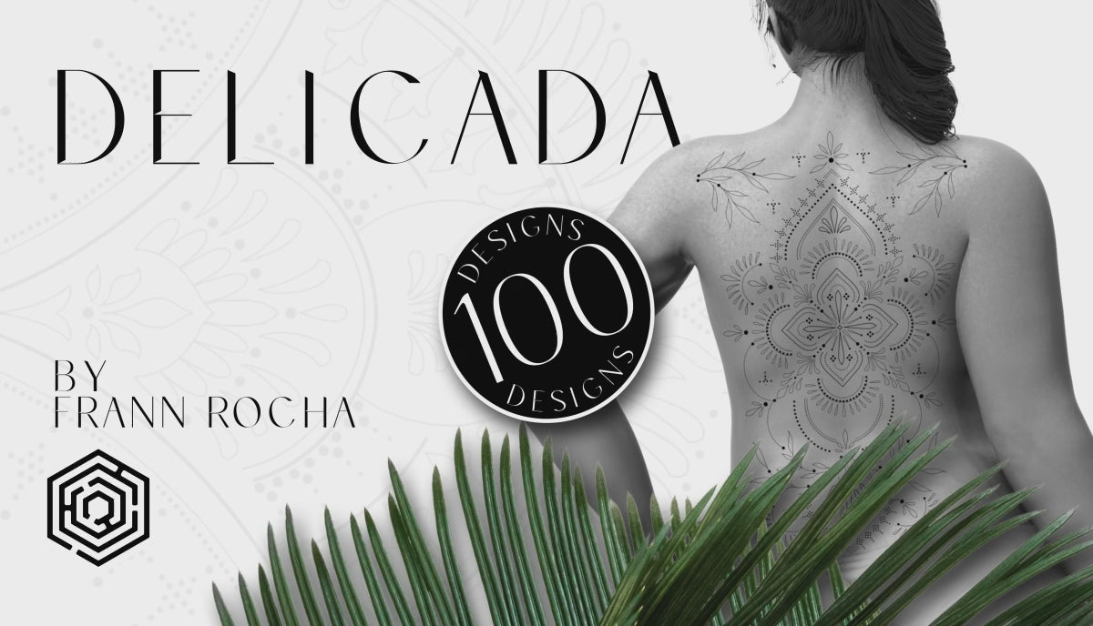 From the creative mind of Frann Rocha, Delicada is a beautiful collection of 100 thin-lined, ornamental tattoo flash stamps for Procreate on the iPad. Frann has optimized each design for specific placement on the body and included these placements in a downloadable reference eBook. Tattoo Smart encourages you to explore these designs with your client to find just the right fit and placement.