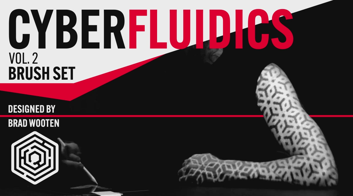 Following the tattoo community’s incredible feedback to his first set, Brad Wooten ventured further into the past for inspiration for the future of tattooing in CYBERFLUIDICS Vol. 2.Within the set, you’ll find 63 brushes, each with inverse variations, and fine-tuned pressure sensitivity. The patterns, based on Persian art, ferrofluid movement, space and extraterrestrial influences, and trippy shapes, give you a complete set of tools to experiment with across a range of styles, sizes, and density variations.Paired with CYBERFLUIDICS Vol. 1, you’ll be able to combine the geometric, ornamental, and organic patterns in Volumes 1 and 2 to create dynamic tattoo patterns at any size, for any project.Use the brushes in this set on their own, or as added elements, in your next project to venture into your own exploration of the ancient future with CYBERFLUIDICS Vol. 2.