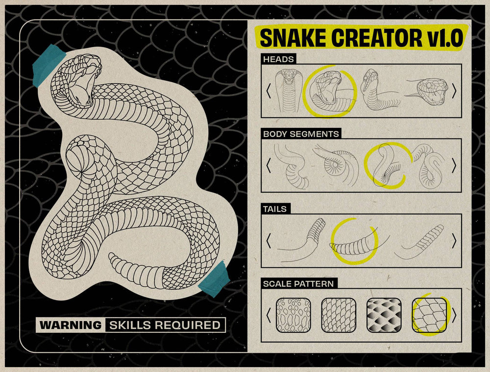 To finish your snake design, the kit comes complete with dozens of snake and cobra head stamps, reflecting a range of "emotion" and actions. The faces' angles and perspectives make them easily adaptable to almost any snake drawing, again in a variety of styles.